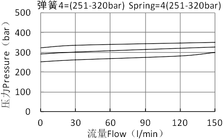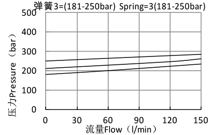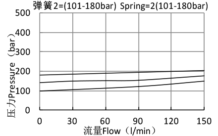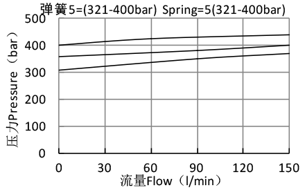 注意: 特性曲線(xiàn)圖顯示出了彈簧的每個(gè)偏差選擇的流量處理能力。在油溫為 40C和粘度 為 46 cst時(shí)記錄了 p/Q 曲線(xiàn)。